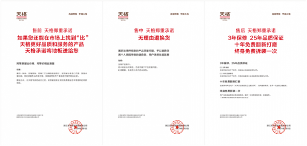 前面說的地板是“半成品”所以安裝很重要;另一方面,地板還是耐用消費(fèi)品,一鋪幾年十幾年甚至幾十年都不會更換。這么長的使用周期里面,怎么保證售后維護(hù)的落地執(zhí)行?這就要說到地板行業(yè)的售后保障情況了。國標(biāo)規(guī)定,地板的保修期為1年,而天格在2018年就推出兩年保修,2024年再次延長至三年。在2020年,天格推出涵蓋售前、售中、售后消費(fèi)全鏈路的“五大承諾”,讓用戶真正實(shí)現(xiàn)“一次消費(fèi),終身受益”。