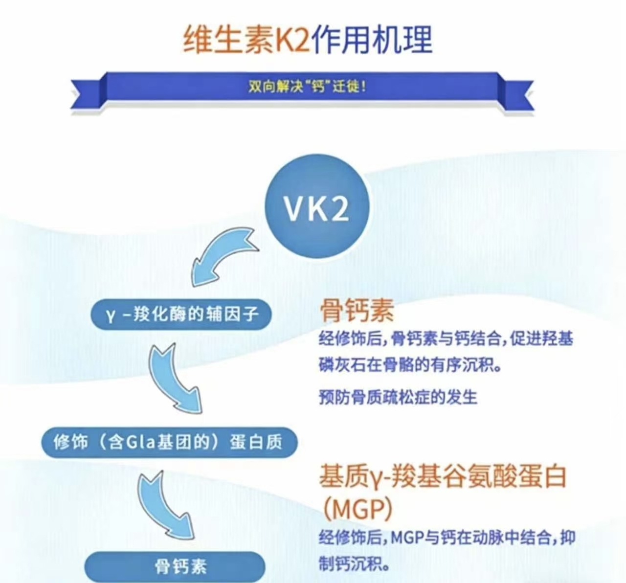 中國營養(yǎng)學會老年營養(yǎng)分會2024年的研究表明,中老年人腸胃吸收功能減弱,即便補充足量鈣,若缺乏引導劑,大部分鈣會隨尿液排出,甚至沉積在血管壁、關節(jié)腔,增加動脈鈣化、關節(jié)疼痛風險。維生素K2可以激活兩種關鍵蛋白-骨鈣素和基質蛋白。激活后的骨鈣素能像抓手一樣,將血液中的鈣牢牢固定在骨骼基質中,提升骨密度;基質蛋白能夠阻止鈣沉積在血管壁、心臟瓣膜等部位,預防血管鈣化,兼顧骨骼與心血管健康。一項發(fā)表在《中華老年醫(yī)學雜志2024》的臨床研究進一步證實:50-75歲人群每日補充含50μg維生素K2(MK-7型,生物利用率最高的K2亞型)的鈣片,持續(xù)12個月后,腰椎骨密度較單純補鈣組提升8.3%,髖部骨折風險降低42%,同時動脈鈣化程度無明顯增加。